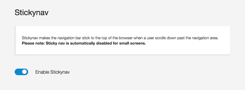 When this option is enabled the top navigation bar will "stick" to the top of the browser window and remain there until the user scrolls back up past it's initial position.